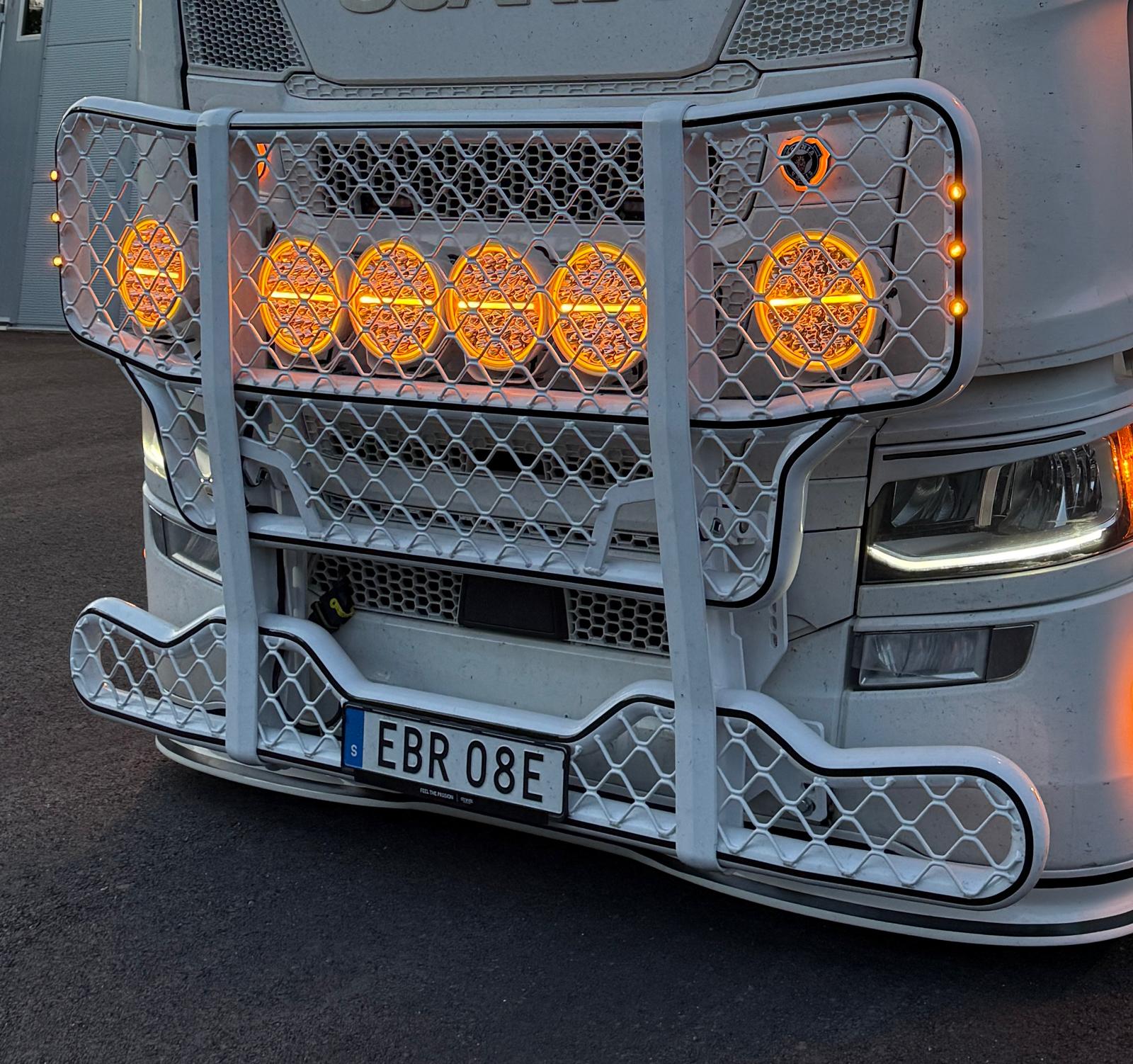 Scania Next Generation Frontskydd med Vingar Uppåt Ge din Scania Next Generation ett grymt och funktionellt utseende med vårt frontskydd designat för att passa den senaste modellen. Med vingar som pekar uppåt får din lastbil en aggressiv och stilren look som utstrålar kraft och precision. Standartutrustat med 6 fasta extra ljusfästen i mitten av frontskyddet, samt ett extra ljusfäste på varje vinge för maximal synlighet på vägen. Oavsett om du kör i mörka förhållanden eller vill sticka ut på vägen, ger denna lösning både ett imponerande utseende och praktisk funktion. Kombinera stil med prestanda och gör din Scania Next Generation till en vägkung! (Godkänt intyg finns för frontskyddet)